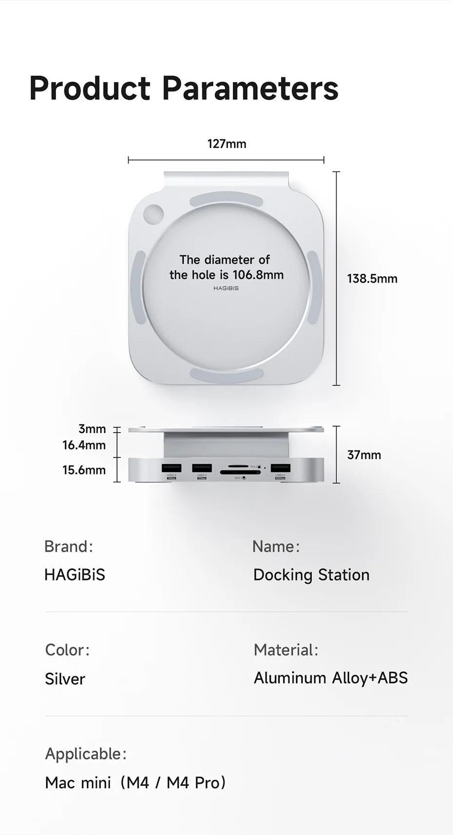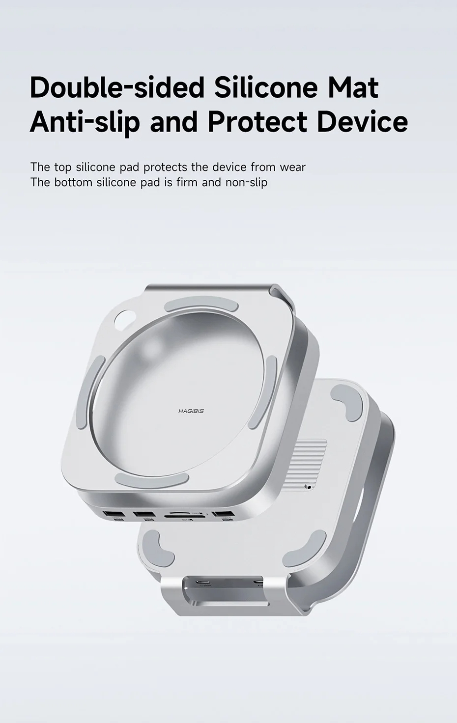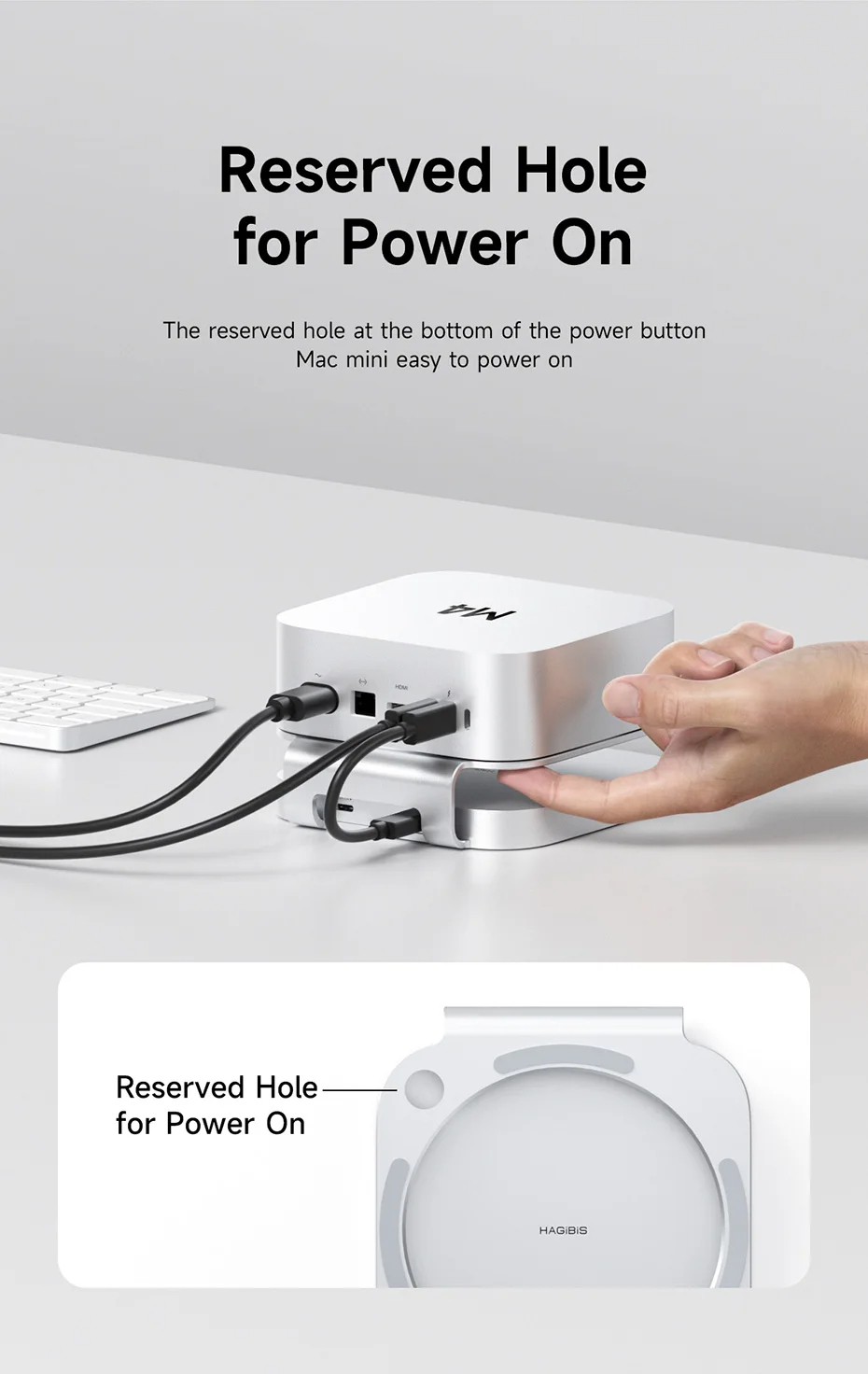 High Efficiency Heat Dissipation: Hagibis Mac Mini M4 Stand has aluminum alloy material which has good heat dissipation effect. And raise the middle design fot better ventilation and heat dissipation. *Note: We have reserved a Mac Mini M4 power on hole in the stand for easy users to power on the Mac Mini M4 at the bottom