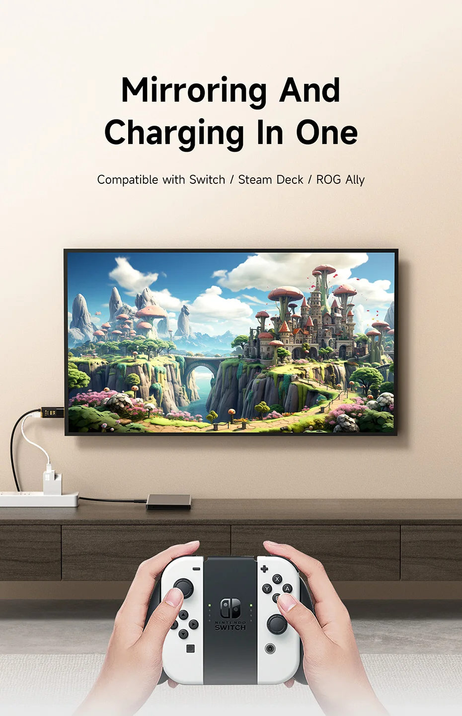 รองรับการชาร์จเร็ว PD: ใช้ชิปอัจฉริยะที่ได้รับการรับรองจาก PD ซึ่งสามารถแปลงแรงดันไฟฟ้าที่ไม่คงที่ให้เป็นแรงดันไฟฟ้าที่เสถียรได้ สาย USB-C to HDMI นี้รองรับการชาร์จเร็ว PD สูงสุด 100W ทำให้สามารถเล่นเกมไปพร้อมกับการชาร์จได้โดยไม่เป็นอันตรายต่อเครื่อง Switch หมายเหตุ: โปรดใช้ที่ชาร์จของ Nintendo Switch อย่างเป็นทางการขณะชาร์จ